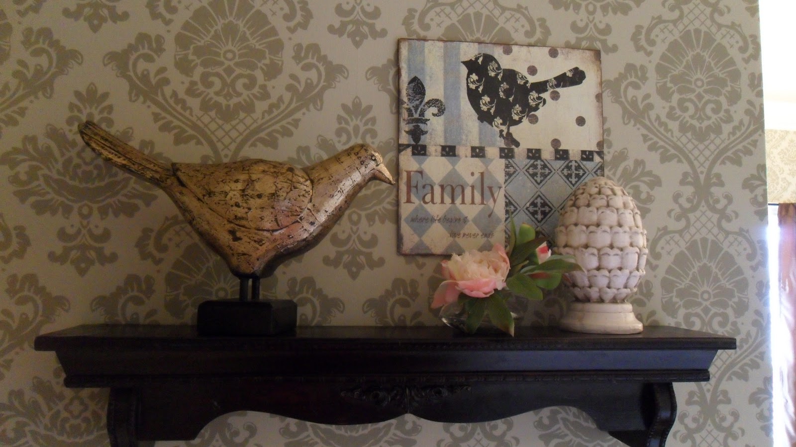 Have an empty space that just needs "something"? I did. I already had the shelf and the goofy wooden bird. Luckily, I found the plaque at Dollar General, and looky looky, it has a birdy! Then, I paired it with a ceramic knoll post from Old Time Pottery and a small flower in a glass vase. It works.